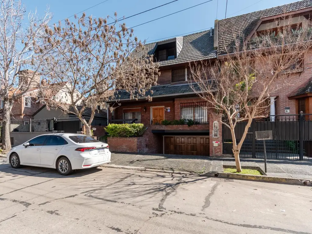 A la casa se ingresa por escalera desde la calle, lo que resulta en una recepción elevada, con mayor luz y privacidad. El living comedor tiene hogar y abarca desde el frente hasta el contrafrente. Toilette de recepción compartimentado. La cocina es amplia con espacio de comedor diario. Tanto del living comedor como de la cocina se accede a una galería que balconea al jardín.