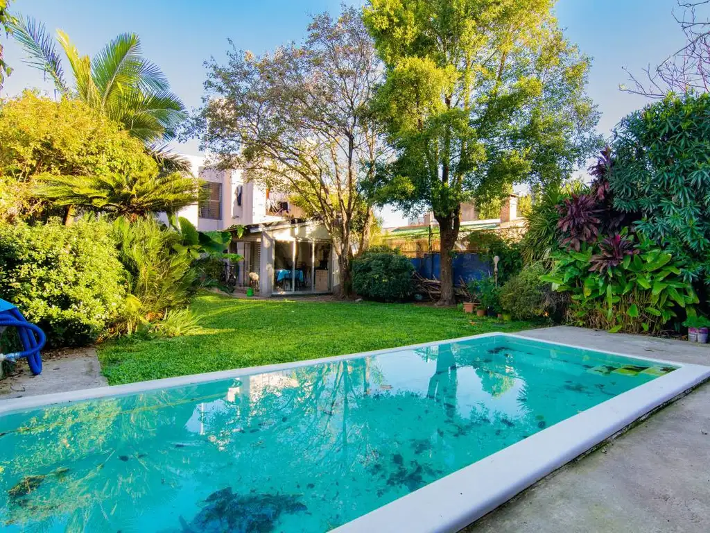 Jardín amplio con piscina, rodeado de verde y árboles, un verdadero pulmón natural en pleno barrio