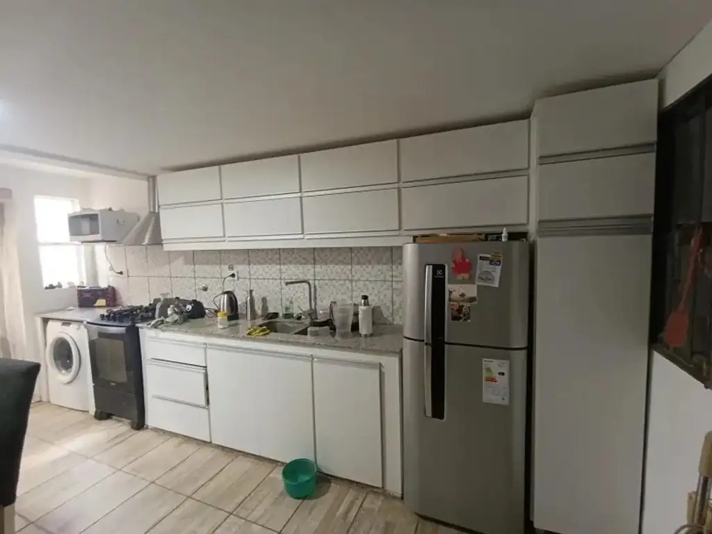 Cocina comedor integrada, con modernos muebles de guardado, alacenas blancas, mesada de granito y conexión para lavarropas