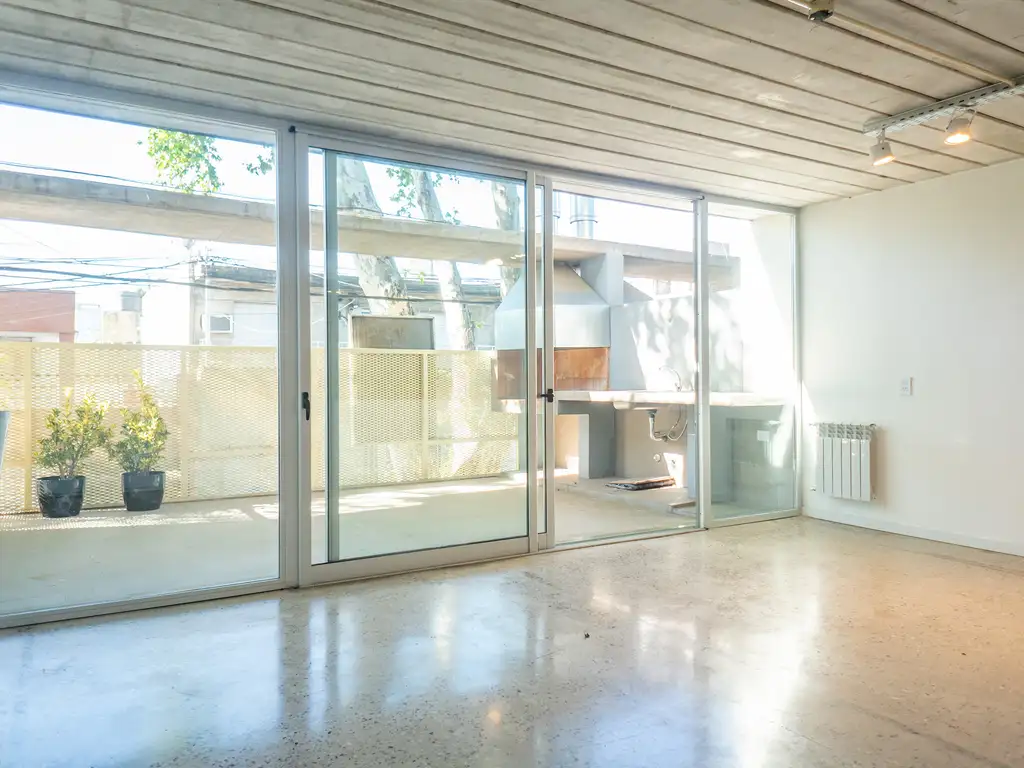 TERMINACIONES Y EQUIPAMIENTO – Pisos de hormigón pulido. – Yesería en paredes y techos de cielorraso suspendido de yeso. – Griferías FV – Aberturas DVH – Calefacción y agua caliente con caldera dual y radiadores – Preinstalación AC – Placares empotrados en dormitorios con interiores – Muebles de cocina con bajo mesada y alacenas – Mesada de mármol granítico brasilero – Horno y anafe