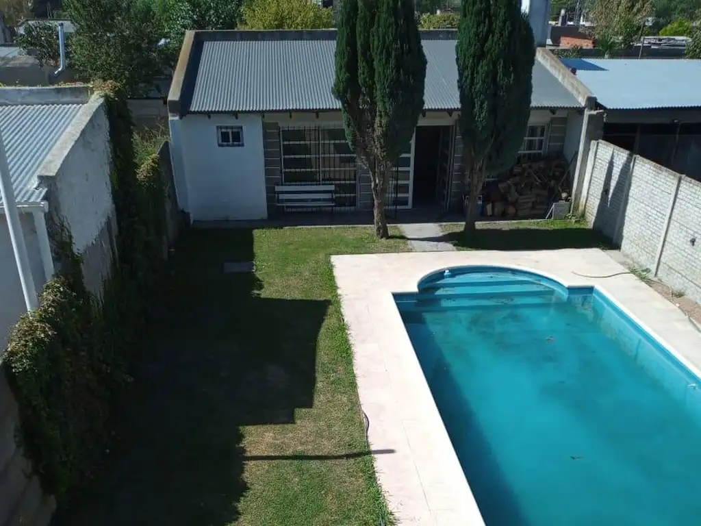 Cuenta con living con cocina integrada y vista al jardin con pileta, cochera amplia, un toilette en el primer piso, y en el entrepiso cuenta con baño completo, y dos dormitorios. Tiene pileta y al fondo un quincho amplio con parrilla y un baño.