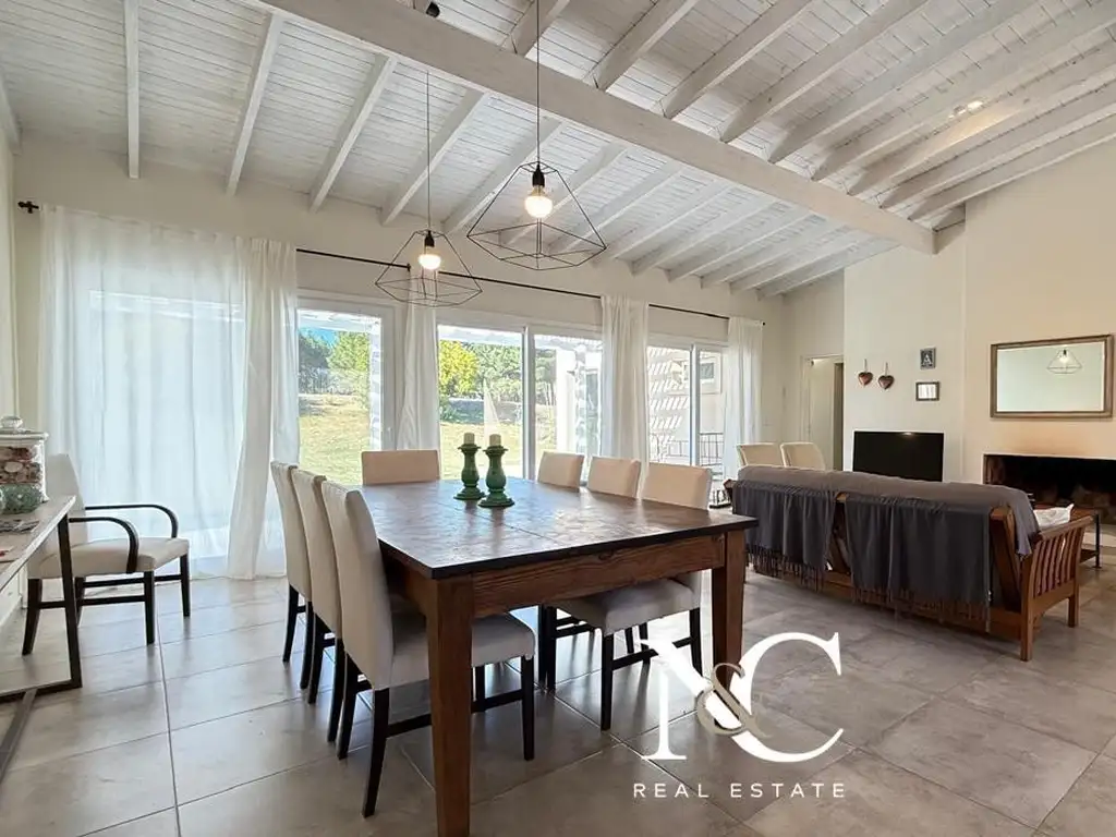Desarrollada en una sola planta, la casa cuenta con amplios ventanales que conectan los espacios interiores con el entorno verde del fairway. El living y comedor se presentan integrados en un ambiente luminoso y cálido, mientras que la cocina semi integrada combina practicidad y estilo, con acceso independiente por una puerta de servicio. Además, dispone de un amplio lavadero, tres cómodas habitaciones y dos baños completos.