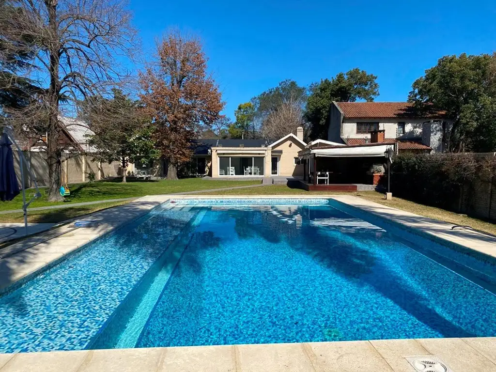 Propiedad en una planta en impecable estado: ingresamos al living comedor con vista al frente y hogar a leña , 2º living comedor muy luminoso con vistas al parque (5x4,50), cocina completa, toillete de recepción, 2 dormitorios en suite (4x2,80 5x3 con vestidor muy amplio), sauna seco, 2 baños completos (las 2 suites). Separado: garage cerrado, amplio escritorio o espacio cerrado. Cuenta con quincho semicubierto con parrilla, horno pizzero, horno de barro y anafe, pileta de natación completa, amplio parque arbolado, solarium, depto de huéspedes de 2 amb, área de servicio, Aire acondicionado y TB en todos los ambientes, aberturas de PVC CON DVH de primera calidad y riego.