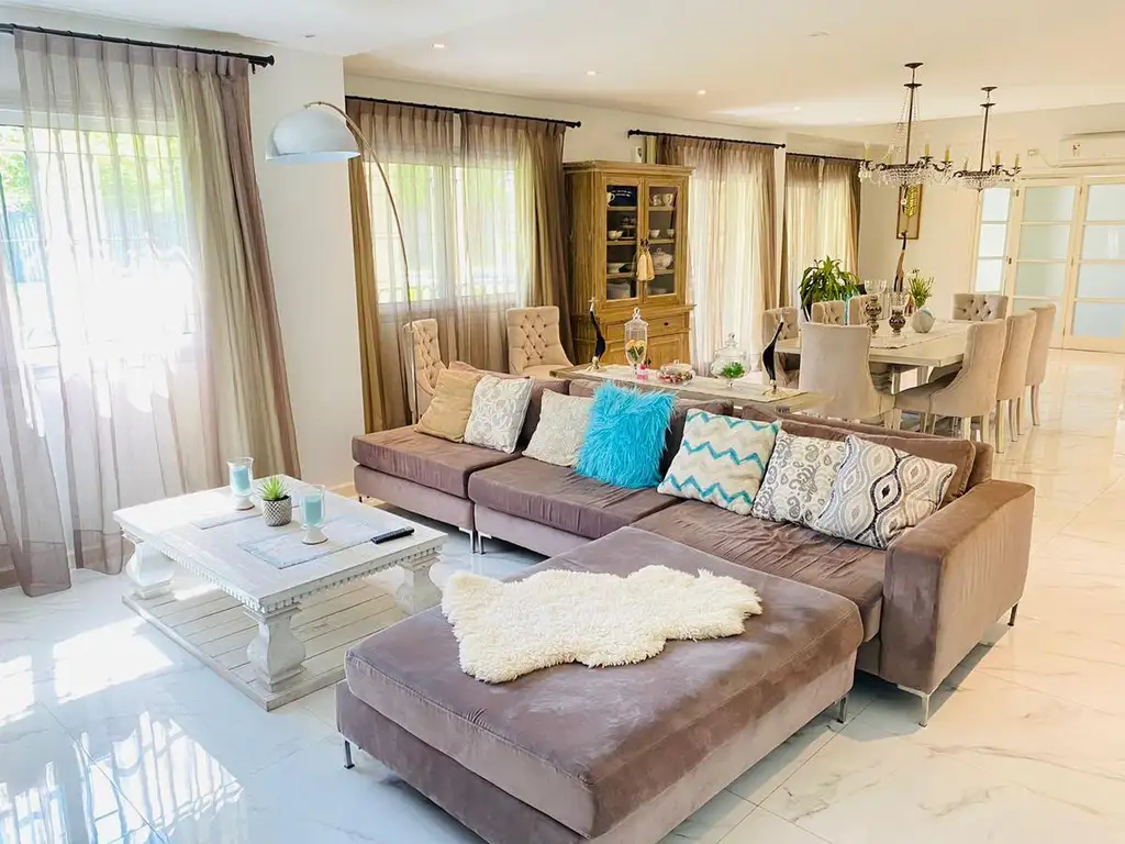 La propiedad se emplaza en un lote de 2400 m2. En la planta baja se ubican las siguientes comodidades: living comedor con playroom, dormitorio en suite, cocina comedor con cava y lavadero integrado, cochera para cuatro autos, parque con piscina climatizada y quincho con parrilla y baño completo, y casa de huéspedes.