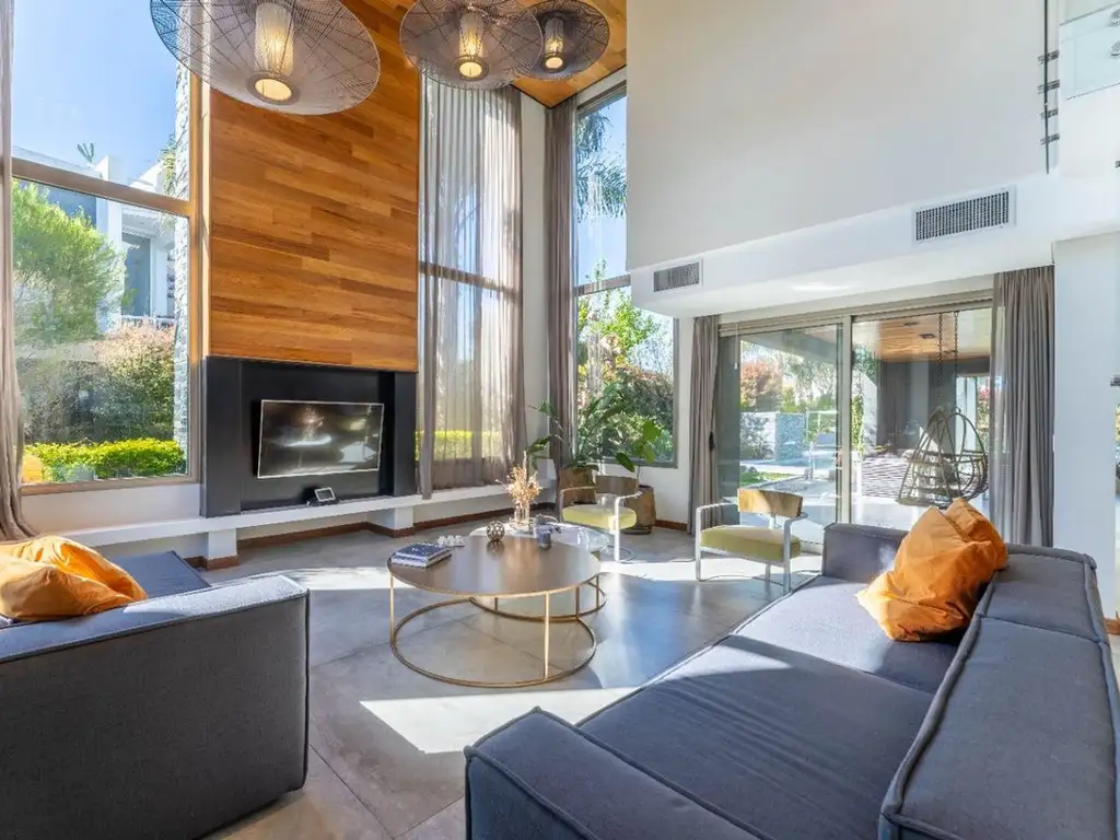 Un hall de acceso con puerta imponente y escalera de mármol blanco con barandas de blindex da la bienvenida a un living de doble altura, con cálidos detalles en madera y amplios ventanales que inundan el espacio de luz natural.