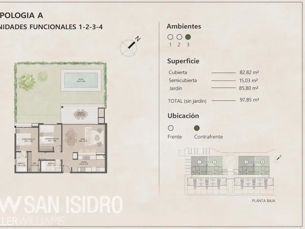Los Departamentos Tipología A con un total de 183,65m2, van a contar con 82,82m2 Cubiertos, 15,03m2 Semicubiertos y 85,80m2 de jardín. (Opcional Pileta Privada de 4m x 2m NO INCLUIDA EN EL PRECIO)Departamento de 3 ambientes, ubicado en PB, de cómodas dimensiones, amplio Living Comedor con salida a una gran Galería con Deck y parrilla , Cocina Americana integrada con isla, baño completo, Dormitorio con placard y Suite Principal con baño, vestidor y salida al jardín.