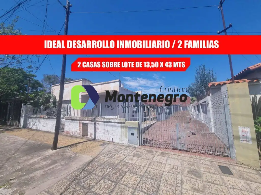 Terreno amplio de 13,50 x 43 mts2 casas de 3 ambientes cada unaGaraje cubierto y entrada para varios autosAmplio fondo libre