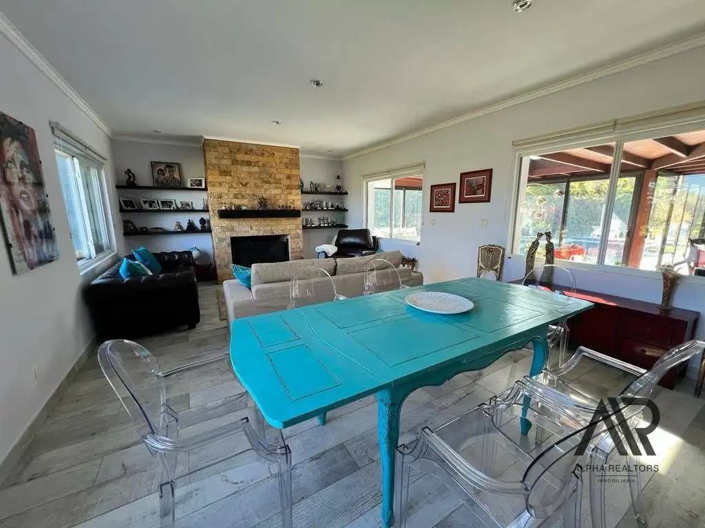 Gran living-comedor con detalles de categoría, mueble botellero y estufa a leña.
