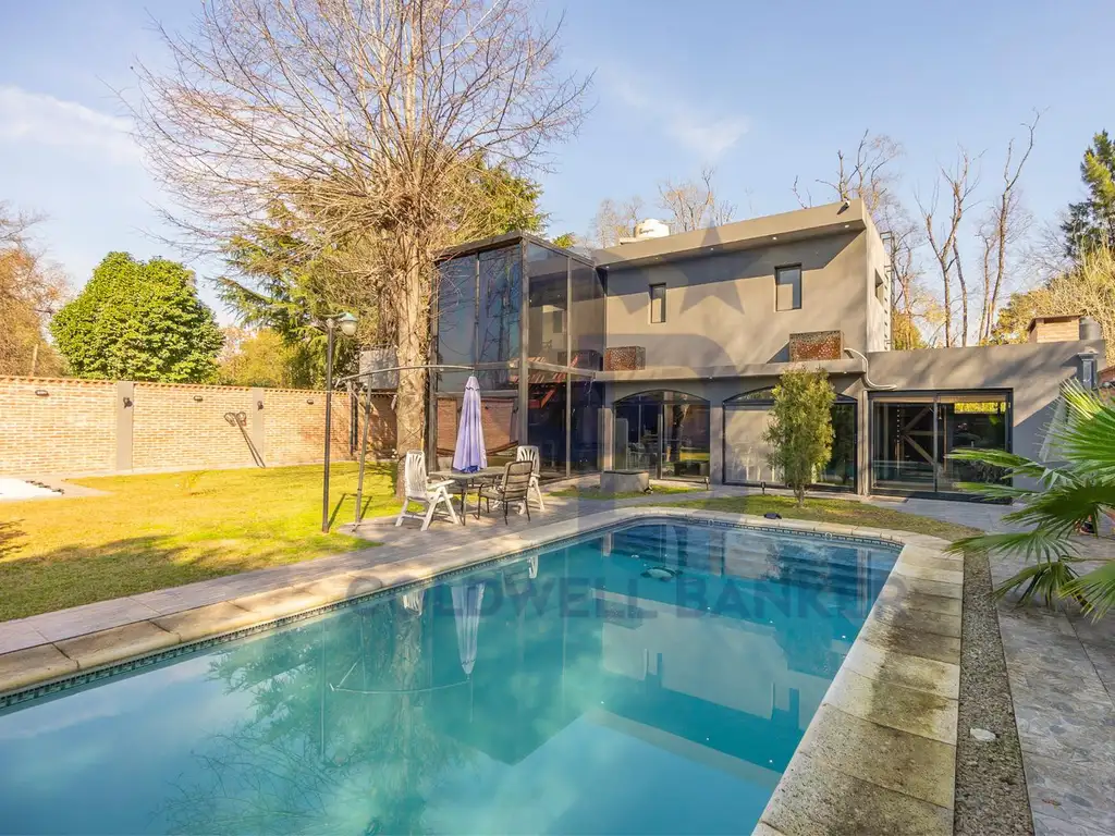 Exterior: Galería cubierta con parrilla, bacha y espacio para heladera. Dos piscinas , una se encuentra preparada para climatizar. Cocheras para 3 autos.