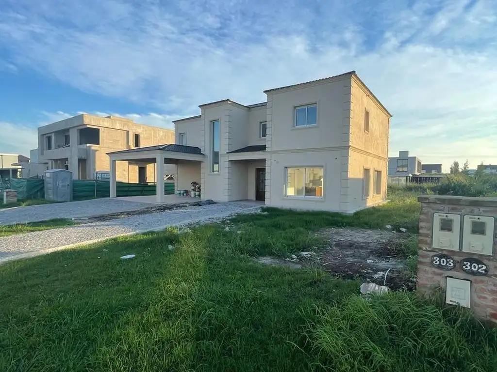 En planta baja, la casa cuenta con un amplio y luminoso living comedor, cocina con desayunador y lavadero independiente. Dispone de una habitación para huéspedes y un baño completo con ducha que también tiene acceso desde la galería. La galería está equipada con parrilla y cerramiento de aluminio con doble vidrio hermético (DVH), lo que permite su uso todo el año. Además, cuenta con cochera cubierta para dos vehículos. La carpintería es de aluminio línea Módena con DVH en toda la casa. La calefacción es por losa radiante, incluyendo también la galería. En el exterior, se encuentra una piscina de 8 x 4 metros.