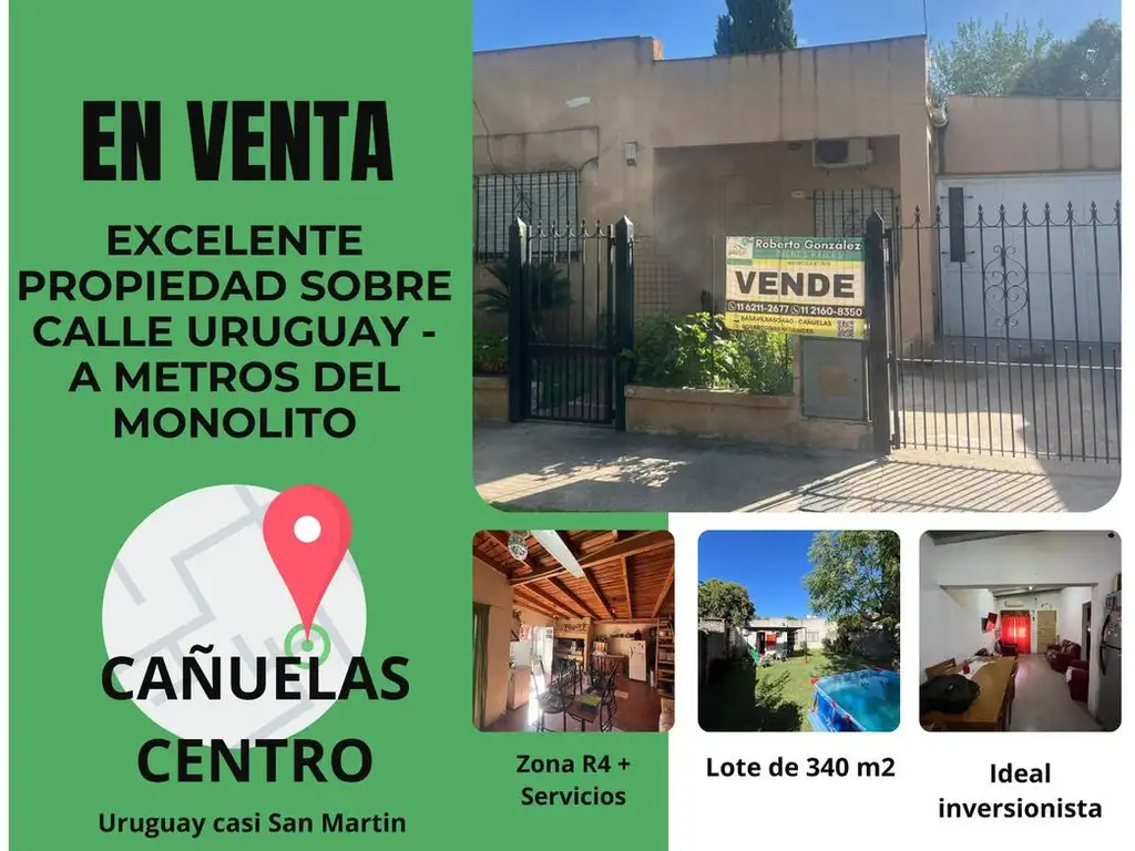 Presentamos esta sólida propiedad ubicada en una de las zonas con mayor flujo vehicular de Cañuelas. Situada sobre la calle Uruguay, a escasos metros del emblemático Monolito, esta ubicación garantiza una exposición máxima para cualquier destino comercial o profesional.La propiedad se emplaza sobre un lote de 340m2 (10 metros de frente por 34 de fondo) y cuenta con todos los servicios esenciales instalados (gas natural, agua corriente y electricidad).