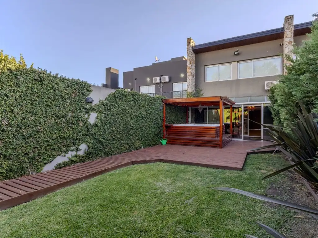 Galería cubierta y vidriada con vista al parque. Hidromasaje para 8 personas, ideal para disfrutar y relajarse.