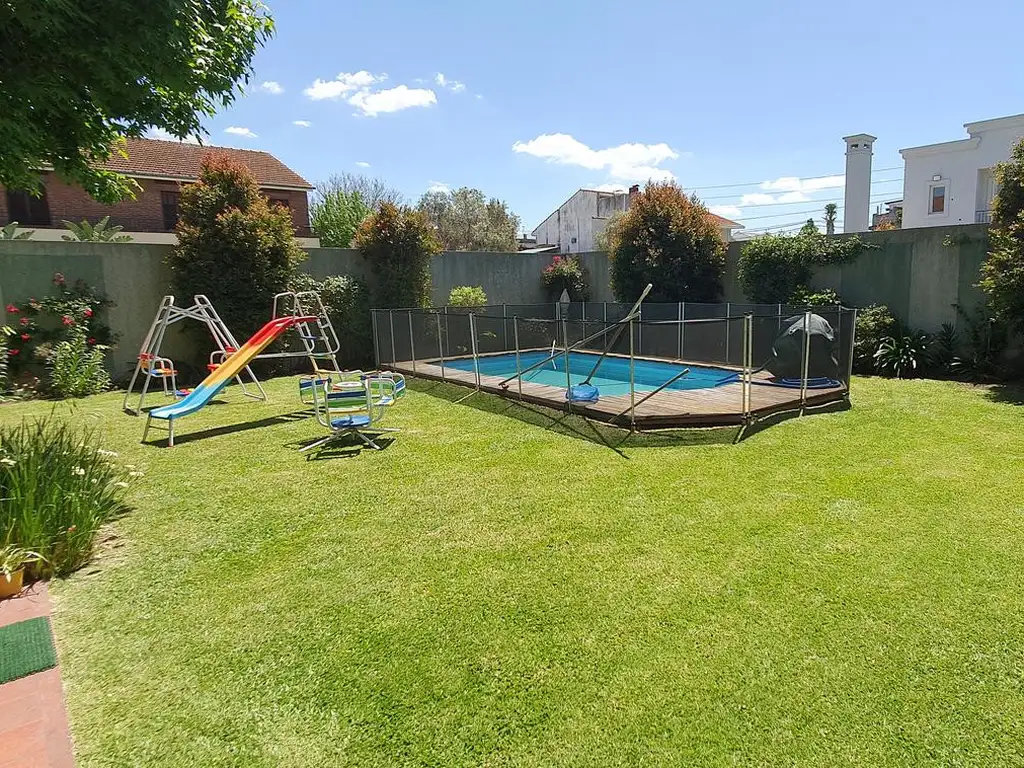Nos sorprende el bello jardín con pileta con protección para niños.