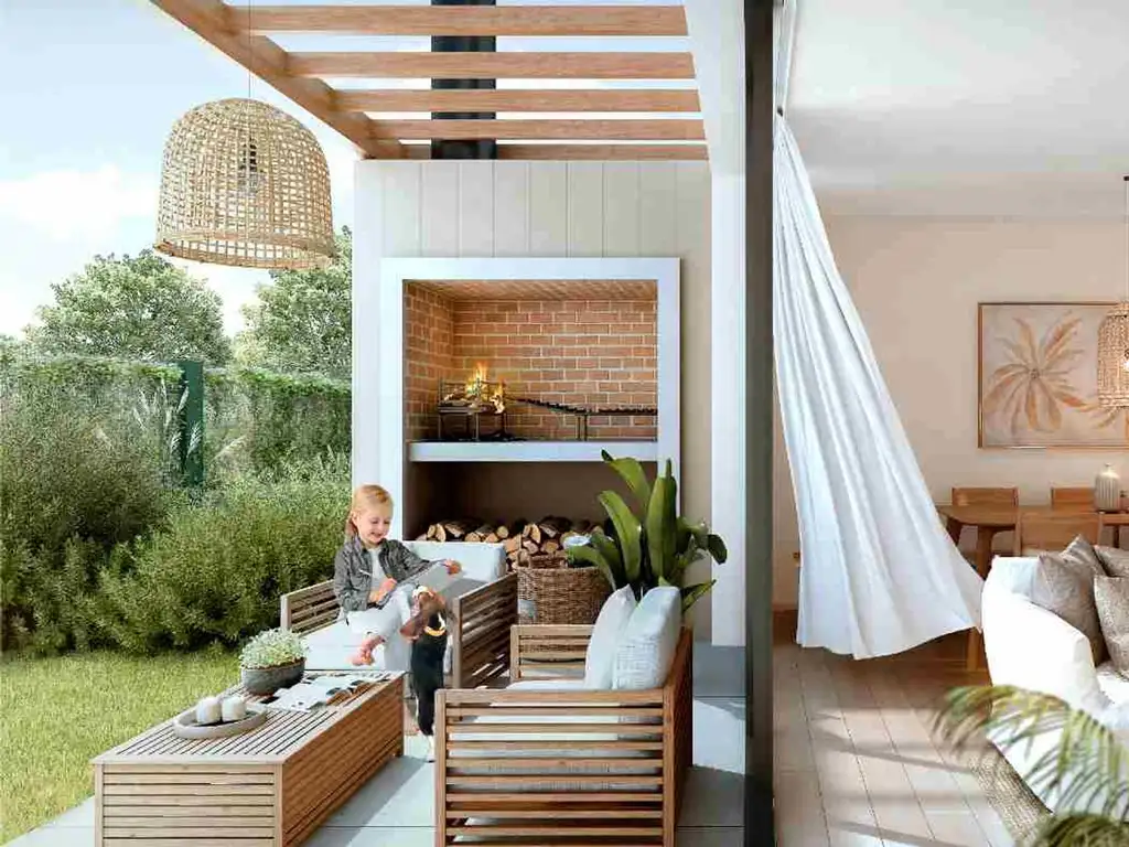 Planta baja cuenta con living comedor con estufa de leña, cocina integrada con comedor diario. Pérgola con parrillero y jardín verde.