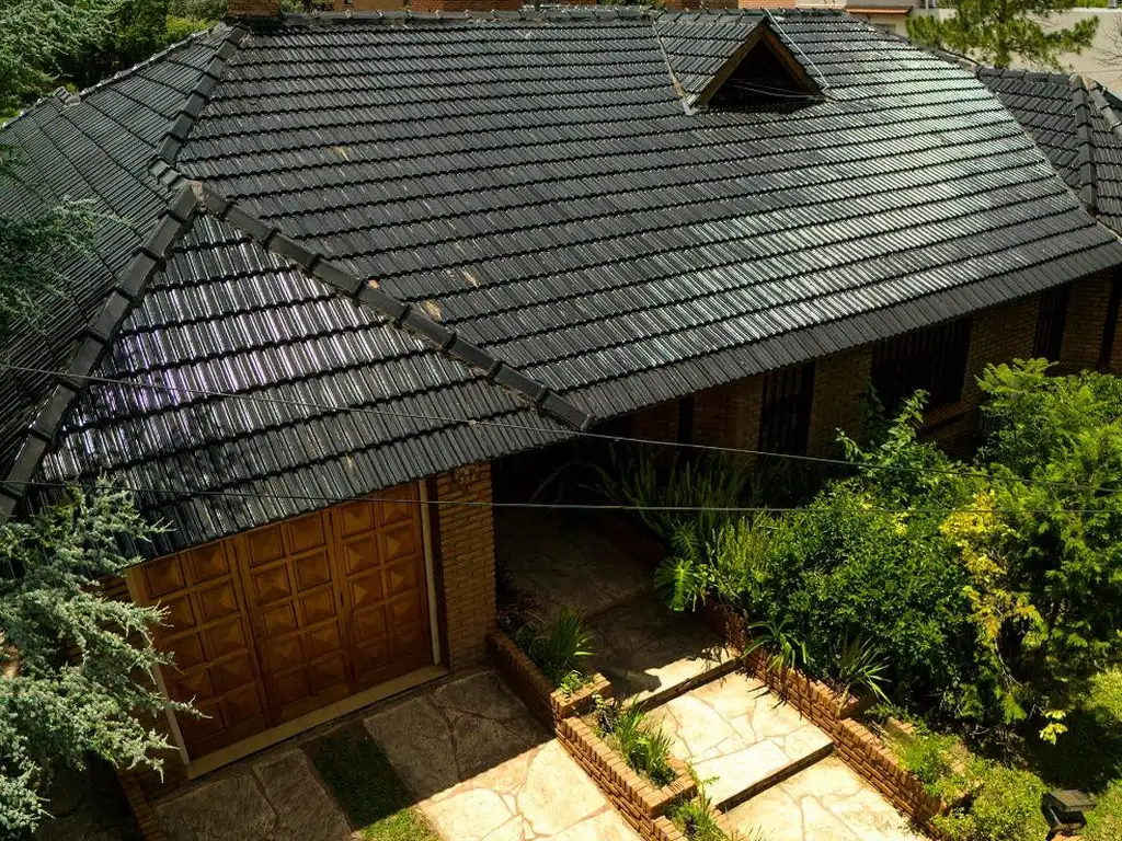 En una planta, aprovechando las grandes dimensiones del terreno (45 metros de frente por 50 metros de largo). Amplia recepción en varios ambientes, a saber, Porch externo, hall de entrada, oficina ó escritorio, living comedor con entrepiso amplio y sala de juegos con salida al patio y jardín trasero; 3 dormitorios (1 en suite) , cocina y comedor diario, lavadero. Amplísimo quincho 7 x 4 con baño. Departamento de huéspedes de 2 ambientes con kichenet y baño. ( 5 baños en total) Cochera cubierta para 2 vehículos y varios más descubiertos. Gran piscina de aprox. 15 x 5 más escalera de acceso. Parque con arboleda añosa.