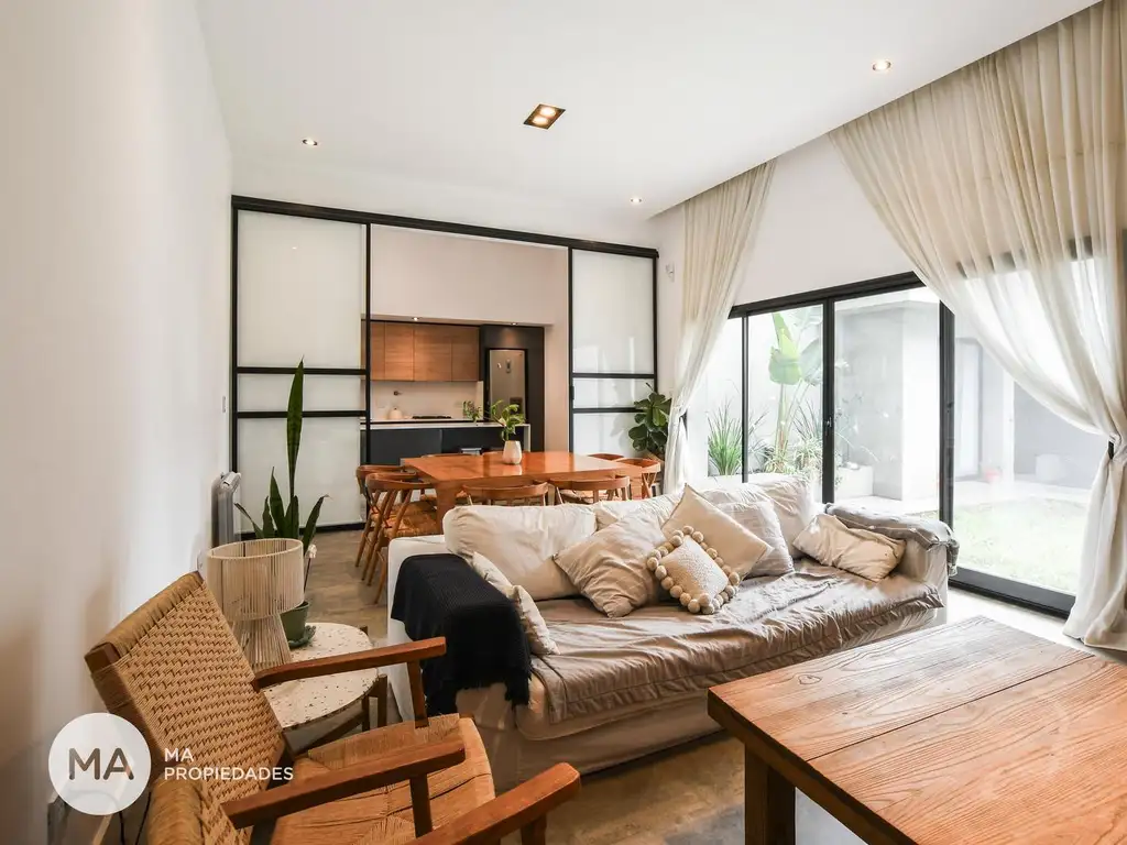 En planta baja se ingresa a un amplio estar comedor muy luminoso, con la cocina separada mediante un elegante vidrio repartido con hojas abatibles que permite integrar o independizar los ambientes. Desde allí se accede directamente a un patio propio. Además, cuenta con un dormitorio con placard empotrado y un baño completo.