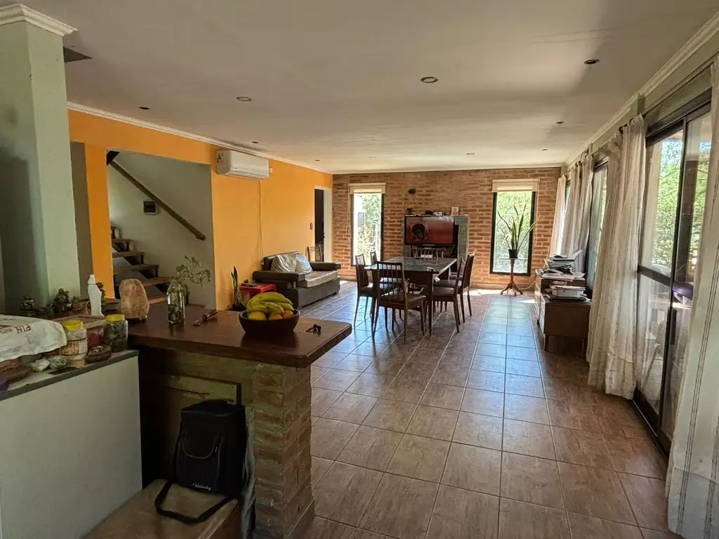 Vivienda sólida, muy luminosa, pensada para vivir cómodo todo el año en zona de vecinos permanentes. En planta baja: living comedor amplio (4,5 × 7 m) con hogar a leña y salamandra Ñuke, cocina semi-industrial con mesada de granito y mueble bajo mesada, lavadero (2,5 × 2,5 m) y baño completo y dormitorio. Salida a gran galería (10 × 3 m) con parrilla y bacha y vista franca al parque.