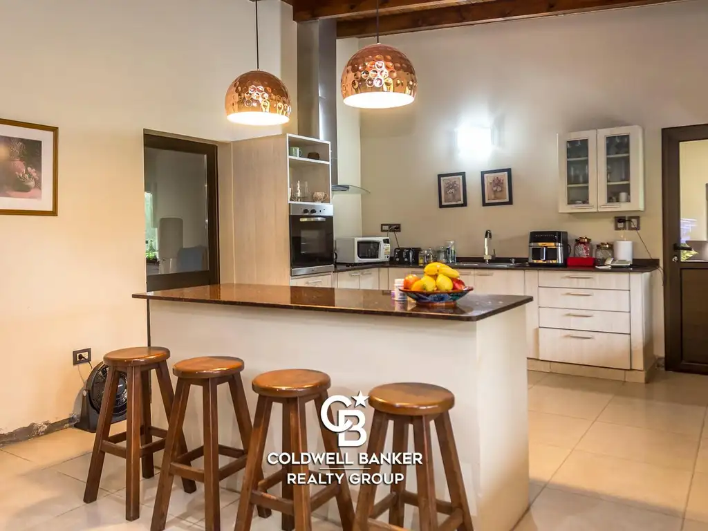 Cocina amplia con barra desayunadora integrada al living comedor