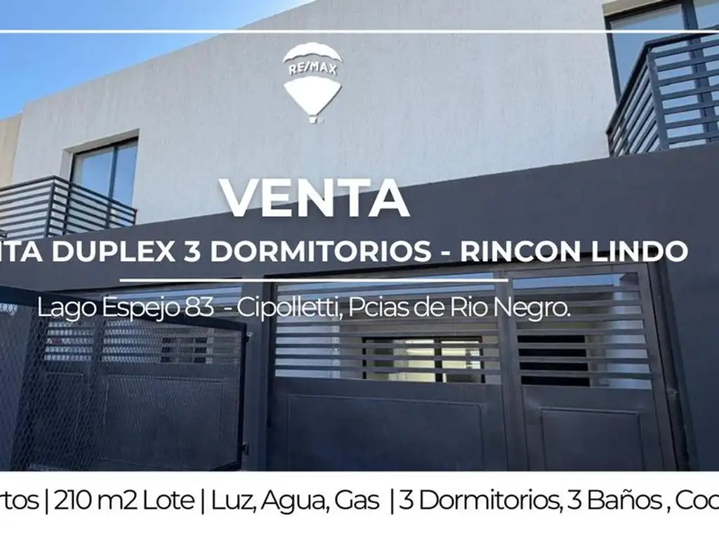 En el exclusivo barrio Rincón Lindo de Cipolletti, Río Negro, se encuentra este impresionante dúplex a la venta, próximo a finalizar su construcción. Con 145 m² construidos sobre un lote de 210 m² (Lote 13, MZA 874), esta propiedad es ideal para quienes buscan confort, calidad y una ubicación estratégica. El diseño moderno y funcional incluye espacios amplios y luminosos, con materiales de primera calidad que aseguran una construcción robusta y elegante. Se destacan los pisos de porcelanato y las aberturas de aluminio con doble vidrio, brindando un excelente aislamiento térmico y acústico. Esta oportunidad única ofrece la combinación perfecta de estilo y comodidad, en una zona tranquila y de creciente valorización.
