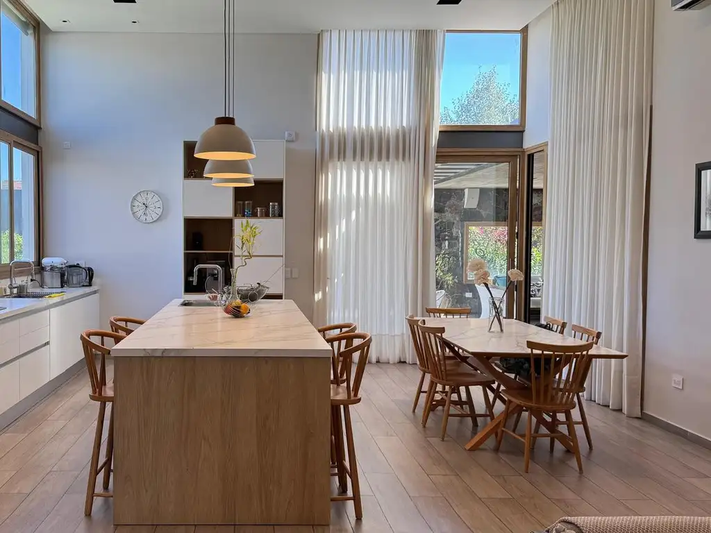 La casa, construida hace tan solo dos años, cuenta con una superficie cubierta de 450 m2 y ofrece un diseño moderno, confortable y de alta calidad constructiva. Está equipada con sistema de losa radiante y domótica integral que permite controlar la iluminación, las cortinas y la climatización desde cualquier dispositivo. Las aberturas son de PVC símil madera, brindando excelente aislación y estética cálida.