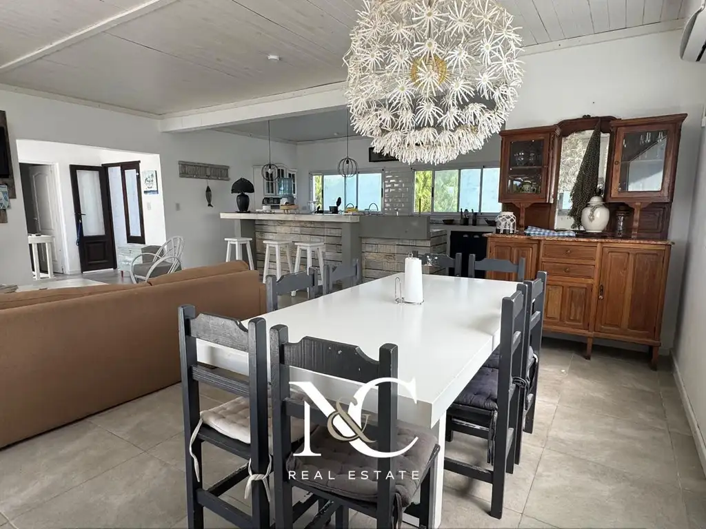 La casa es un estilo bien playero. Accedemos por una escalera al living comedor con cocina integrada, con barra desayunadora, un espacio con sillones, hogar a lena y mesa para 8 personas. Lavadero independiente.