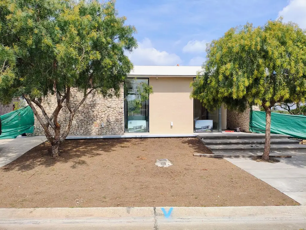 La propiedad se encuentra desarrollada en un lote íntegramente en una planta baja y en L, dividiendo espacialmente en dos bloques el ámbito público sobre el privado. El primer bloque de carácter público, se destaca por poseer doble circulación. El acceso principal es al living comedor, y la entrada de servicio, lateral desde la cocina. La cocina integrada posee ventilación natural con muebles de cocina y alacenas, barra con bacha doble y conexión bajo mesada para lavarropas. Dicho ambiente tiene acceso directo a la galería con parrilla de 16 m2. Por el pasillo que va hacia las habitaciones, se encuentra el toilette de recepción y uno de los patios de la casa.El segundo bloque de carácter privado, el cual posee 2.60 metros de altura terminada, contiene 2 dormitorios que corresponden a usos particulares y que están conectados por un baño compartido y uno de los patios. Dormitorio principal en suite que cuenta con un vestidor luminoso y un baño muy cómodo. La pasarela articuladora de los dormitorios contiene aberturas que proporcionan luz y ventilación a la circulación y placares de guardado. Todos los dormitorios poseen acceso directo al parque que contará con una pileta de 3.50 x 7.00 metros.