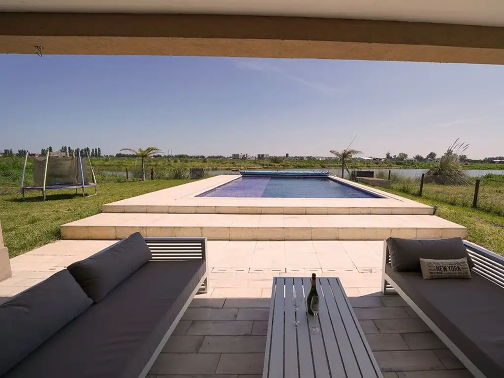 El garaje cubierto tiene espacio para dos camionetas y está equipado con portón elevadizo. En el exterior, una hermosa piscina de 10 x 5 con revestimiento de venecitas, luces importadas y climatizador, además de un cobertor que la mantiene en perfecto estado. También cuenta con parrilla, horno y fogón para disfrutar al aire libre, y un sistema de riego por aspersión automático que facilita el mantenimiento del jardín.
