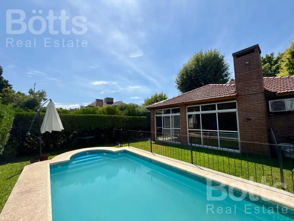 Disfruta de una galería en L con cerramiento y parrilla techada, ideal para reuniones. El jardín cuenta con una piscina y riego automático, perfectos para relajarse al aire libre. La casa está equipada con tres aires acondicionados, calefacción por estufa de tiro balanceado y un acogedor hogar a gas.