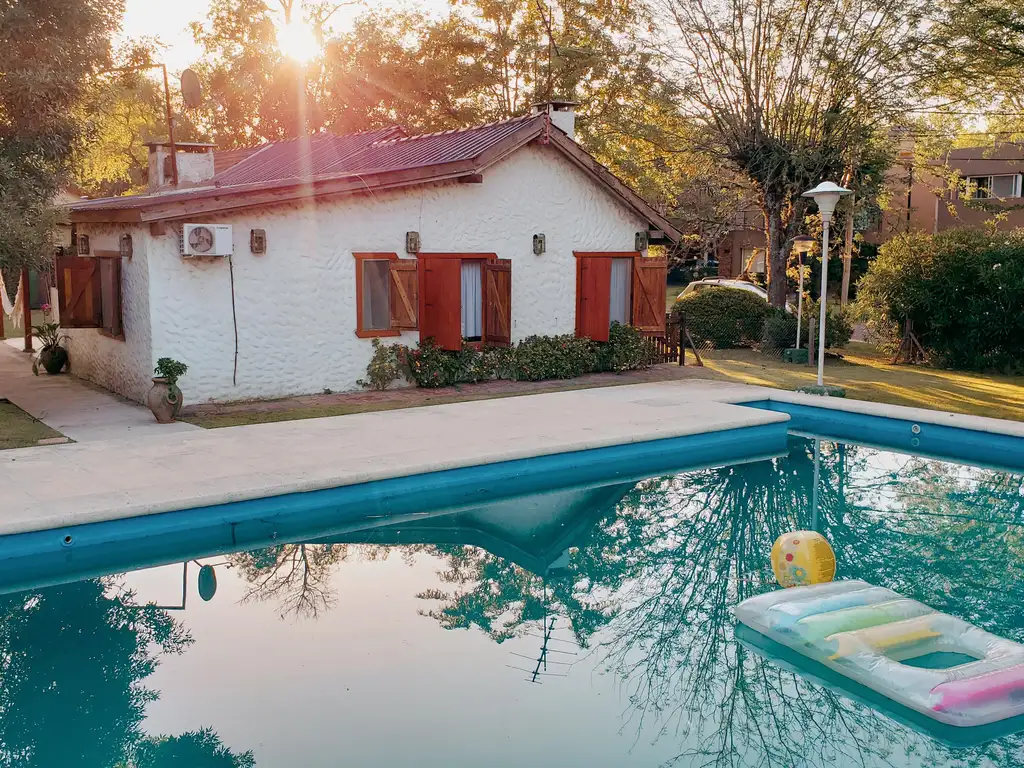 Cochera para 2 autos, quincho con parrilla y lavadero. Amplio parque con gran arboleda, cuarto utilero, horno pizzero, piscina de 9x5m con solario húmedo y riego por aspersión.