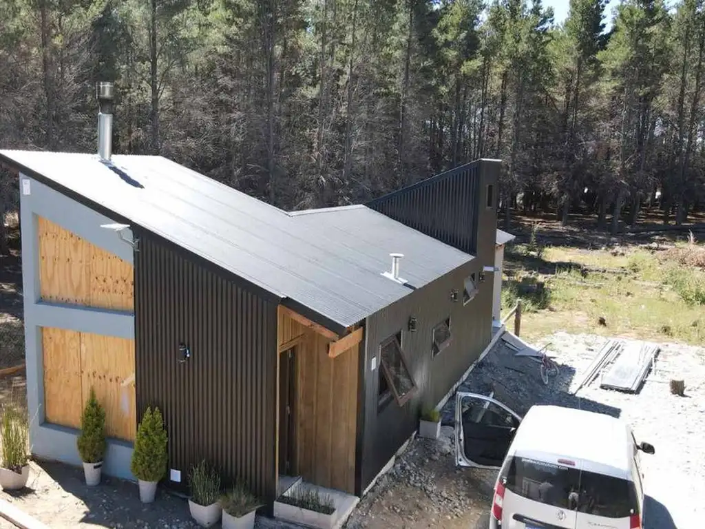 La casa dispone de dos dormitorios cómodos. Además, incluye un amplio lavadero con caldera dual y un estacionamiento techado que ofrece versatilidad: puede transformarse fácilmente en quincho o taller cerrándolo con una lona durante el invierno. La calefacción se resuelve mediante losa radiante, sectorizada con dos termostatos independientes para regular por separado los dormitorios y las áreas sociales, asegurando un consumo eficiente y programadas a traves del celular. Hogar tromen en el living para noches romanticas.