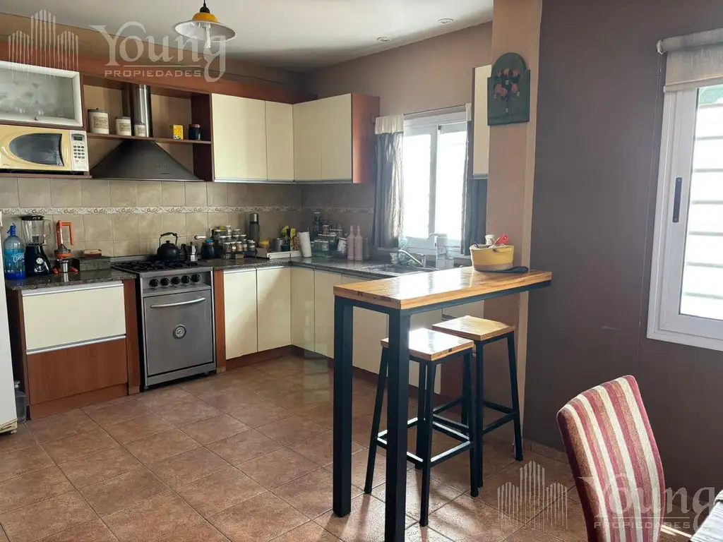 Al ingresar a la propiedad, se accede a un amplio living con pisos cerámicos que irradia calidez y confort. El comedor luminoso y espacioso, perfecto para compartir momentos con familiares y amigos. Cocina semiintegrada separada por barra desayunadora.