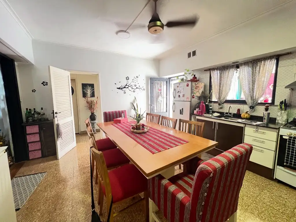 En planta baja cuenta con ingreso al living, cocina comedor muy amplia con iluminacion y ventilacion natural, un dormitorio que podria anexarse facilmente al living generando mayor amplitud, baño completo y escritorio, desde la cocina accedemos a el patio con dos sectores, uno semicubierto con parrillero cocina espacio de bacha y lavadero y otro descubierto.