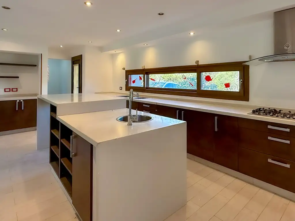 La cocina cuenta con mesadas de silestone, alacenas y detalles de acero inoxidable, así como una doble bacha y un cuarto de lavado.