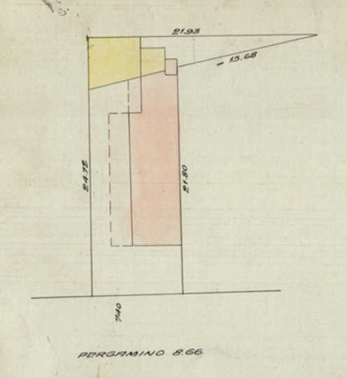 Es un terreno atípico, además del ancho de 8.66 m y el largo de 24.72 m, incluye un espacio triangular adicional que agrega un área para estudio o taller.