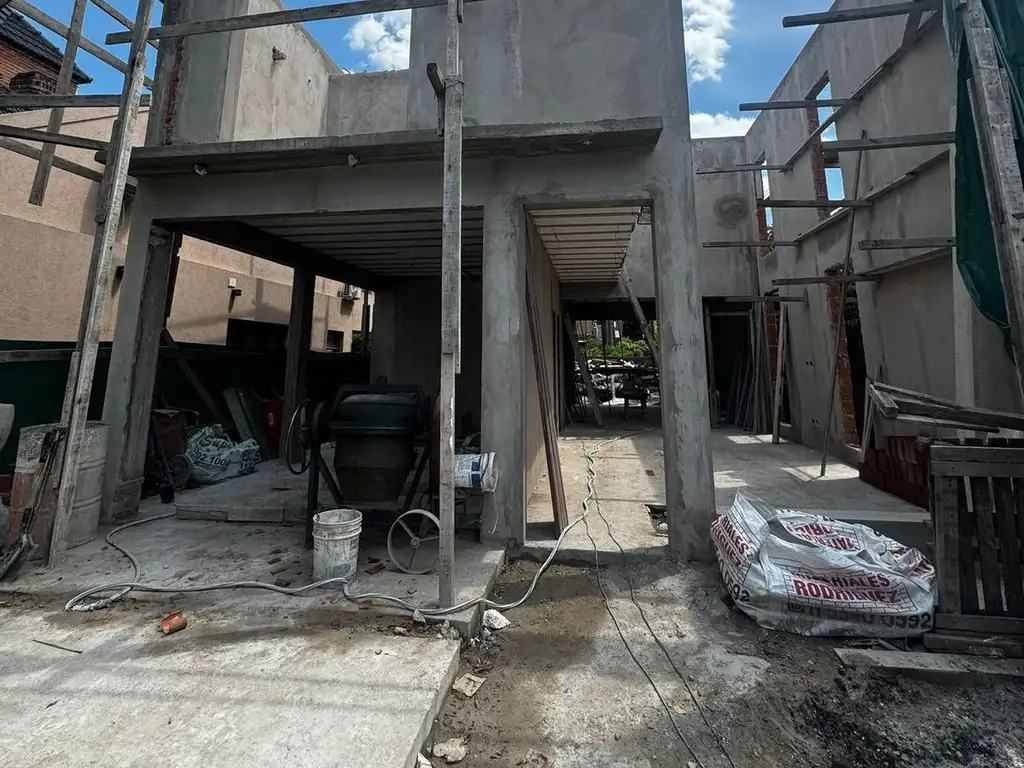 El entrepiso es de losa alivianada y la cubierta de la planta alta es de chapa montada sobre perfilería metálica y