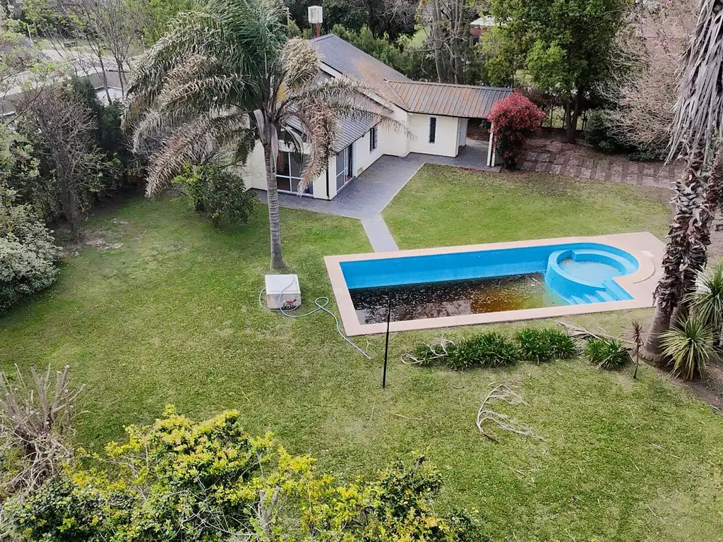 La casa se dispone en esquina y permitiría separala para poder construir en los otros lotes libre , Gran Piscina , ambiente único tipo cocina comedor estar, 2 dormitorios y un bano , con un entre piso que puede ser un estudio y tercer dormitorio , quincho separada con bano y cuarto de guardado , 120 m2 aproximadamente