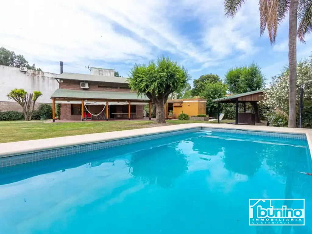 En el exterior de la casa se encuentra una amplia galería, un baño, un cuarto pequeño, el cual puede ser utilizado como cuarto de huésped, de herramientas o baulera, un hermoso jardín verde con añosos árboles y con una gran piscina de 8m x 4m de espejo de agua, que cuenta con solárium de loza blanca. La piscina dispone de filtro automático y temporizador. Además, en el exterior también se encuentra el parrillero cubierto.