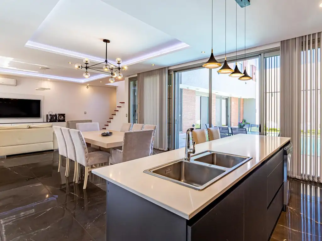 Quincho completo con parrilla, cocina y baño. Piscina con iluminación Led. Cochera para dos vehículos, con portón automático y piso de alto tránsito.