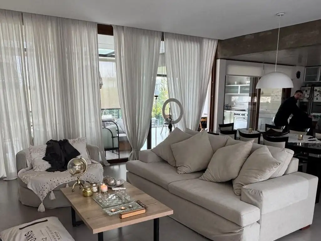En la planta baja, se destaca un amplio living luminoso con ventilación cruzada y vistas al parque delantero y trasero, que invitan a disfrutar de la naturaleza en todo momento. La cocina, espaciosa y equipada con muebles premium, cuenta con ventanales de PVC y DVH que realzan su luminosidad. El living-comedor, con pisos de porcelanato, se conecta directamente con el parque a través de puertas vidriadas de piso a techo, creando una integración perfecta entre el interior y el exterior. Completan esta planta un amplio estar semicubierto, un baño con ducha, un quincho de grandes dimensiones con parrilla y baño, y un lavadero junto a un cuarto de guardado.