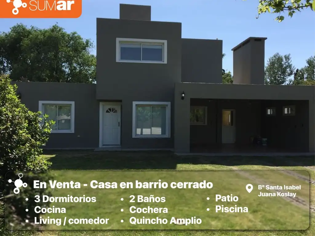 Excelente propiedad ubicada a metros de las sierras puntanas, específicamente en barrio cerrado Santa Isabel, Juana Koslay, San Luis. Cuenta con 3 dormitorios (2 en planta baja y 1 en planta alta), 2 baños(uno en cada planta). Living, comedor, cocina, quincho, cochera, patio con piscina. Calefacción por caldera y aires acondicionados. El terreno es de aprox. 1000mts2 y la propiedad aprox. 200 mts2.