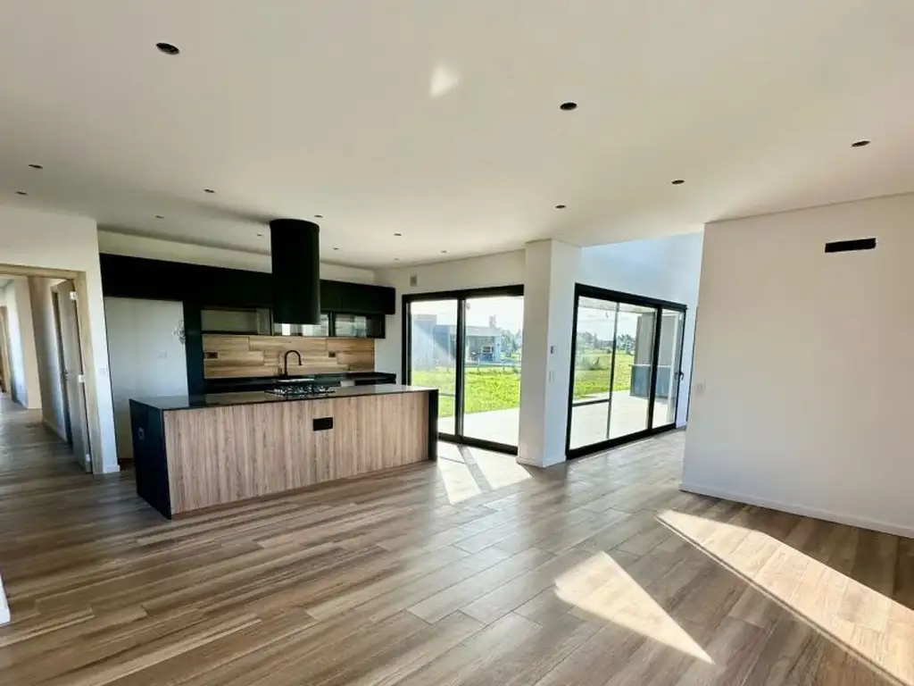 3 dormitorios ( 1 master suite con sector vestidor y baño completo), placard con interiores y todos con vista al verde gozando de una increíble luz natural.Cocina comedor total black con muebles y griferias de calidad, totalmente equipada con horno, anafe y campana.Living comedor con amplios ventanales y techo doble altura.4 baños en total ( 1 toillette de recepcion, baño principal, baño en suite y baño en exterior).Lavadero estilo americanoExterior: galeria semicubierta con parrilla y horno, isla, bacha y baño.Piscina de 3x8Extras: Cerco vivo colocado.
