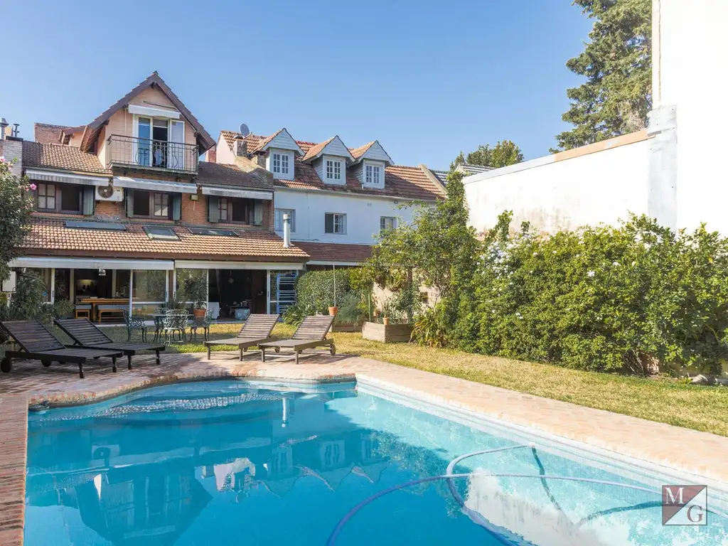Hall de entrada. Living con chimenea y comedor con doble altura, claraboyas que iluminan el ambiente con luz natural y hogar, comunicado con galería cerrada tipo family o quincho, con parrilla y horno pizzero a leña, e importante
