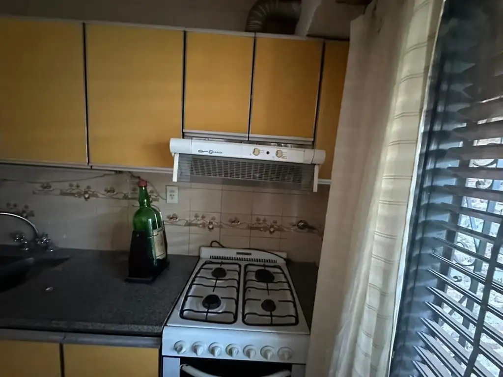 Amplio living comedor con cocina integrada, equipada con muebles bajo y sobre mesada