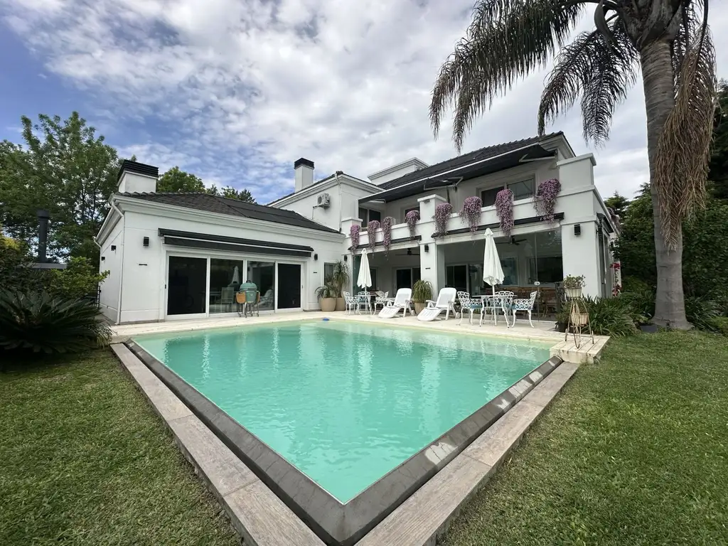 Un espacio adicional en planta baja está diseñado como sala multiuso, completamente equipada con parrilla de alta calidad, cocina, baño completo y muebles a medida. Este ambiente tiene salida directa al parque y resulta perfecto para reuniones, actividades familiares o recreativas.Además, la planta baja cuenta con una habitación que actualmente funciona como gimnasio, y un lavadero.