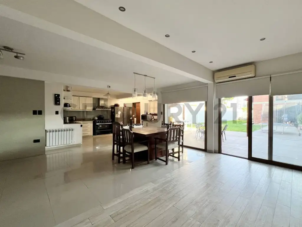 En la planta baja se focaliza como área común y social, un living-comedor espacioso con estufa salamandra LEPEN de gran porte con acceso a la cochera cubierta y salida a la galería semicubierta por puerta ventana brindando iluminación natural en el ambiente. Cuenta con cocina toda equipada con muebles bajo y sobre mesada de madera maciza que se dispone de forma corrida y perimetral con platea de granito pulido, equipo extractor de humo y cocina de seis hornallas de acero inoxidable. Contiguo, pero separado dispone un lavadero con baño completo y ducha con acceso a la galería y jardín. En el otro extremo de la cocina desarrolla un pasillo corredor contando con cuarto de dispensa como también las escaleras que dirigen el área de descanso del inmueble.