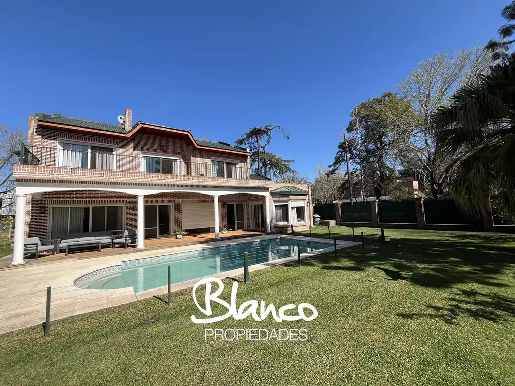 Exterior: Galería con deck. Quincho con parrilla y baño de pileta. Pileta climatizada, con material importado que no necesita mantenimiento. Hermoso jardín con riego por aspersión automático y con sol durante todo el dia. Cochera cubierta para dos autos con entrada directa a la sección de servicio y luego a la cocina. El amplio jardín posee una construcción de 100 mts , actualmente utilizada como garage (con capacidad para seis autos), sala de juegos y de cine; y un quincho con parrilla y baño.