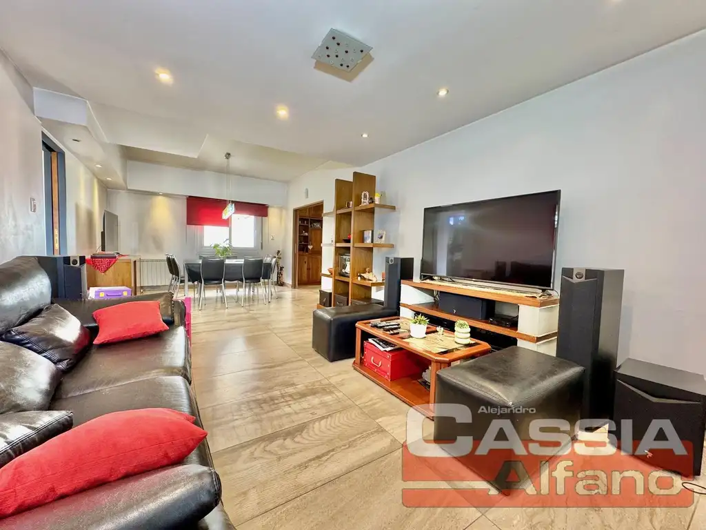 Ingreso a vivienda por amplia escalera con peldaños de Porcelanato simil piedra, Hall distribuidor, paredes de yeso, techos en perfecto estado, Super luminoso gracias a sus ventanas perimetrales instaladas con cerramientos de PVC con DVH (doble vidrio hermético), LIVING-COMEDOR super amplio de 4 x 8 metros, pisos en porcelanato "ILVA", doble circulación de aire. Dormitorio principal pisos flotantes y VESTIDOR empotrado con su interior y puertas completas marca Johnson, Ventanal de PVC, con persianas tipo barrio de aluminio, y DVH. Dormitorio secundario super amplio con espacio para escritorio, posee placar completo Johnson, pisos flotantes aleman y ventanal a la calle. Un BAñO integramente reciclado con excelente gusto estético, integramente revestido con ducha completa y 1/2 mampara, sanitarios y griferías de primera. Cocina separada pisos porcelanato y super luminosa con amoblamientos de bajo y sobre mesada JOHNSON", amplios espacios dedicados a heladera y alacenas, campana extractora "CATA", y artefacto de cocina acero inoxidable "ARISTON" todo funcionando en perfecto estado. Lavadero semi integrado con muebles de bajo y mesadas de granito. Acceso a Patio interno tipo balcón terraza, y escaleras que comunican con la tercera planta tipo terraza libre semi techada con espacio para parrilla, y conexión de gas natural preparada, mesada con bacha, tanque elevado y cuarto de enceres con caldera y termotanque alta recuperación diferenciados. Garage cerrado con portón que corresponde a la vivienda.