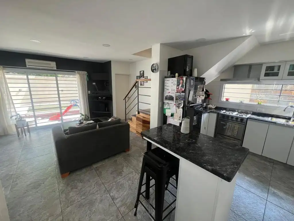 Cocina comedor inategrada al living, cuenta con sus muebles bajo mesada y alacena, barra desayunadora con banquetas, ventanas al jardín.