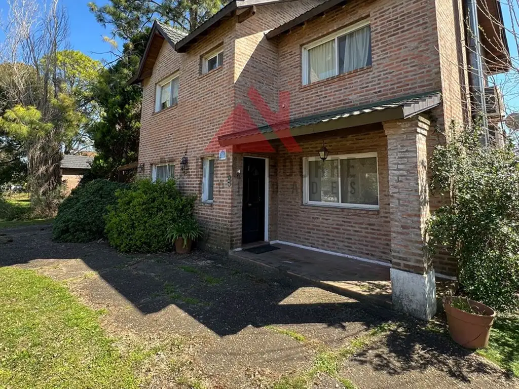 La vivienda principal, se trata de un chalet de ladrillo a la vista y cuenta con cuatro dormitorios, tres de ellos ubicados en la planta alta, que además dispone de una amplia terraza con vista al jardín. En la planta baja se encuentra un toilette, un baño completo, cocina integrada con desayunador y salida a la galería, lavadero, y un luminoso living-comedor con hogar y ventanales que conectan con la galería principal.