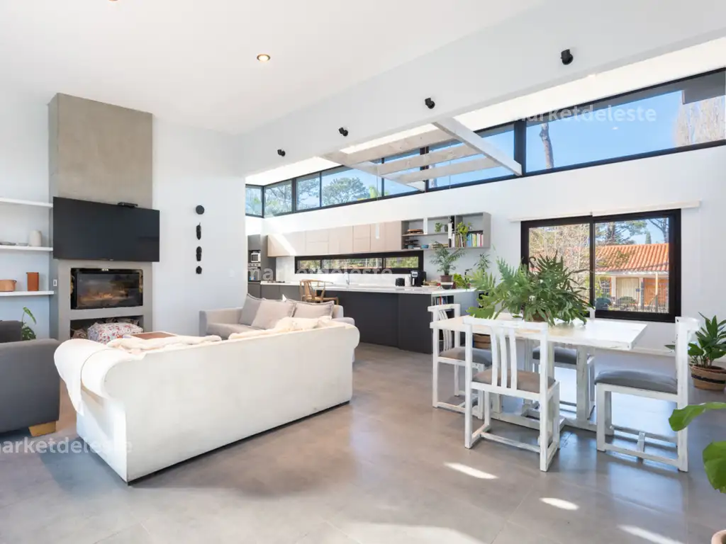 Moderna casa ubicada sobre un lote de 750 mts en la zona de Punta Shopping. Cuenta con 3 dormitorios en suite, living comedor integrado con la cocina. Parrillero a continuación del living techado con aluminio y vidrio, generando una sensación de unión entre ambos espacios. Deck de madera curada alrededor de la casa. Posee además cochera para dos autos, losa radiante a gas en toda la casa, piscina climatizada inverter con salinizador, aire acondicionado en todos los ambientes, sistema de cámaras, aberturas en vidrios DVH, doble pared OSB con aislación térmica acústica y de filtraciones de 6 capas en techo y paredes.